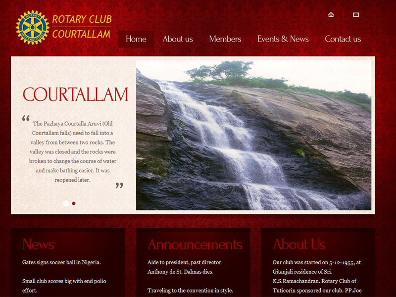 can able to resell the land without any hurdles. The brokerage scheme tracking systems are done through our expertise Human Resource Management (HRM) tool. Login credentials are available to each mediator can trace their business dealt. Buyers can view the plot through plot sketch and get a clear in an incorporated Google map.Rotary Club of Courtallam (RCC) is a static website which gives information about the club. Members from the inception of club have been maintained with picture perfect. The rotary club of courtallam has mini profile about the honorable club members in their ledger. Latest news and events are updated instantly at the entry page of the